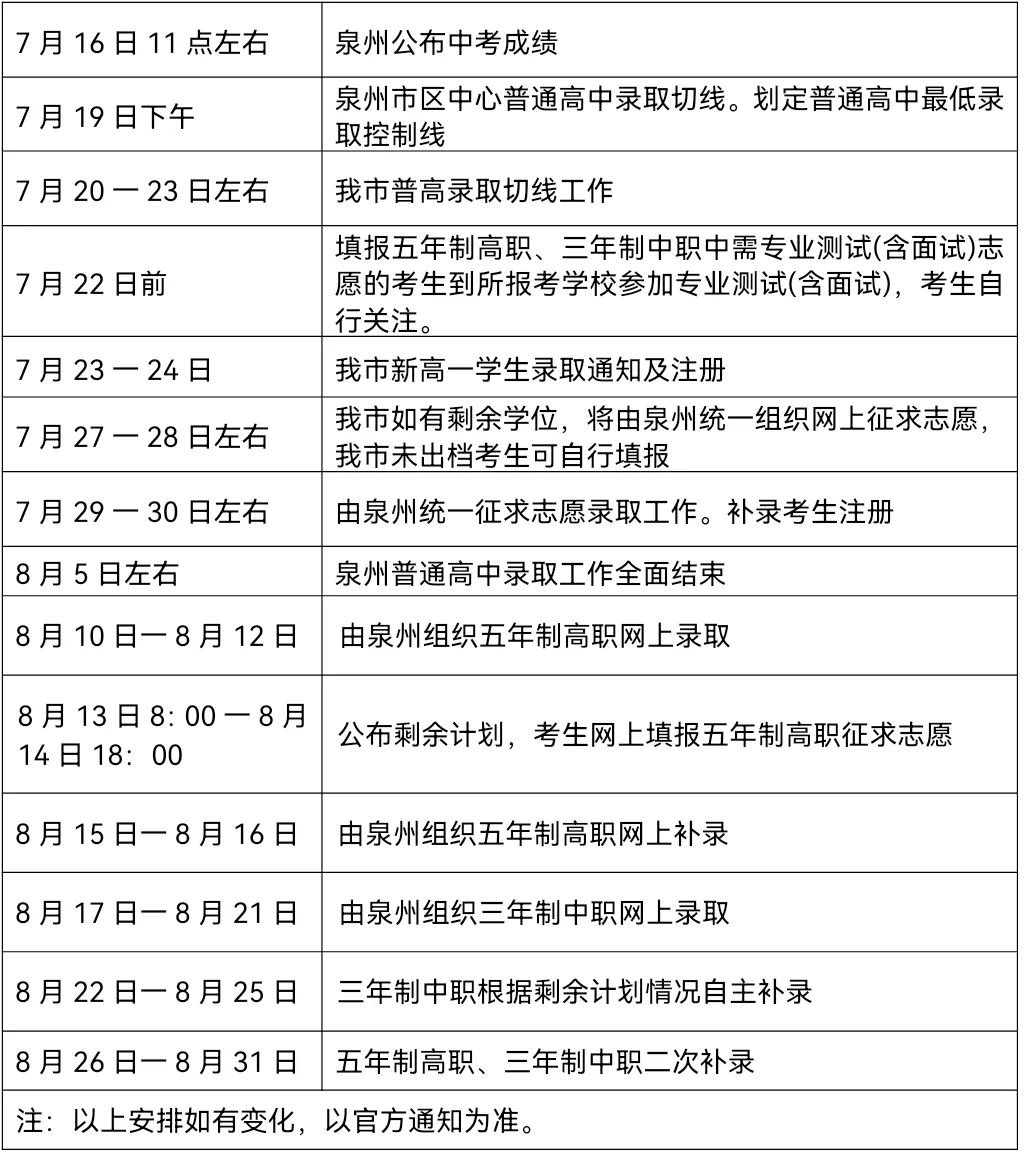 石狮市中招各批次录取时间也已确定,具体见附表: