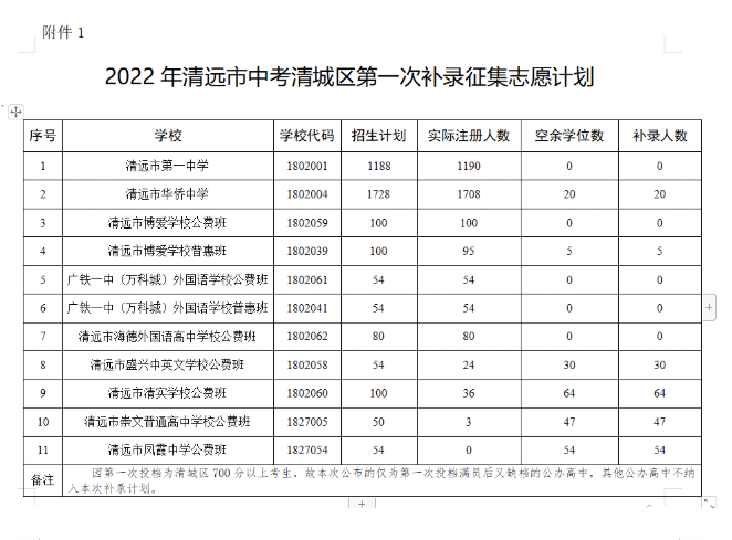 2022年清远市中考清城区第一次补录征集志愿计划