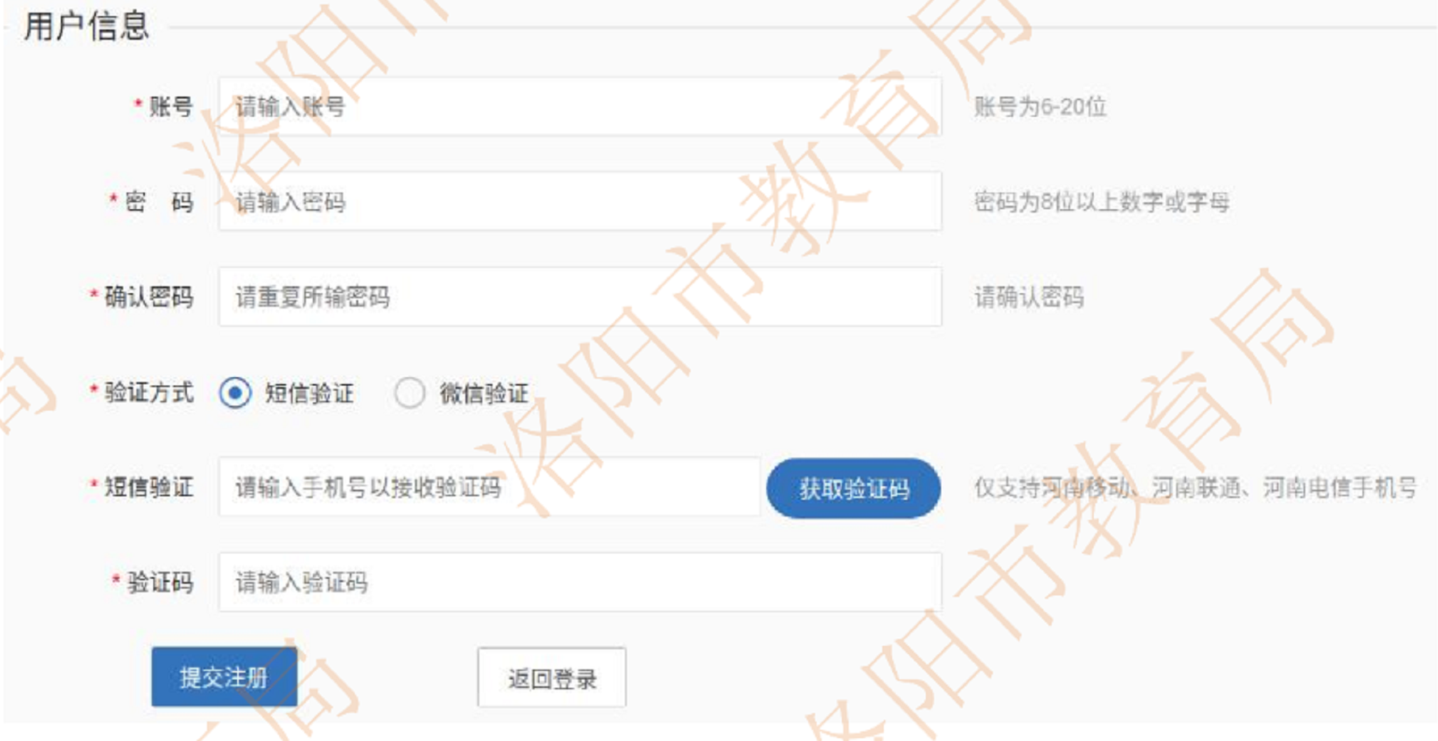 ·验证方式:可以选择“短信验证”或“微信验证”。短信验证输入接收验证码的手机号,手机号仅支持“河南移动”、“河南联通”、“河南电信”手机号。非以上类型手机号可选择“微信验证”,微信扫码关注公众号获取验证码。在“验证码”栏填写短信或微信方式获取的“验证码”。