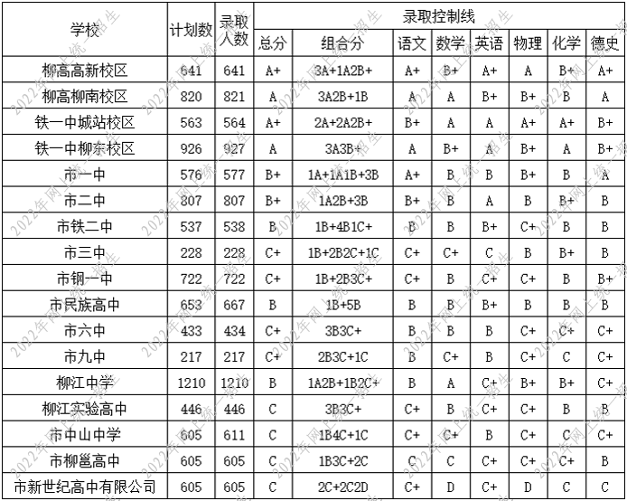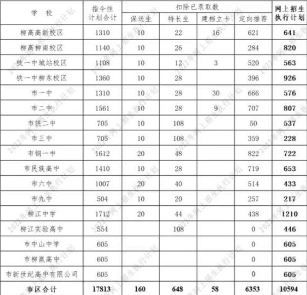 据市招生考试院公布的统一网上招生执行计划数,为各招生学校计划招生总数,扣除免试保送生、特长生、建档立卡优秀生和定向推荐生之后所余名额。本时段总计划数为10594人,其中柳州高中高新校区641人,柳州高中柳南校区820人,柳铁一中城站校区563人,柳铁一中柳东校区926人,市一中576人,市二中807人,铁二中537人,市三中228人,钢一中722人,市民族高中653人,市六中433人,市九中217人,柳江中学1210人,柳江实验高中446人,中山中学605人,柳邕高中605人,新世纪高中有限公司605人。