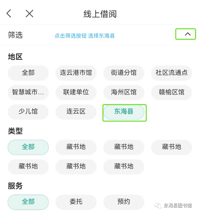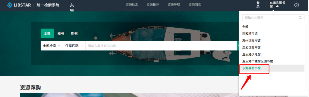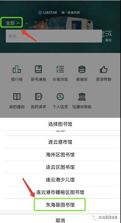 2. 在左上角“全部”选择 东海县图书馆