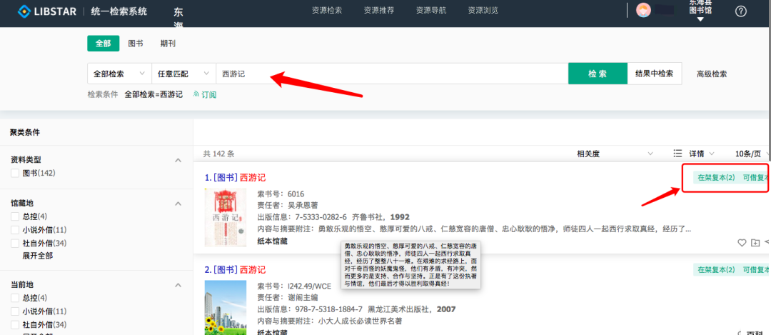 4 登录成功后可在首页检索界面检索图书,查看自己需要图书的单册列表;显示有可借副本的均可点开