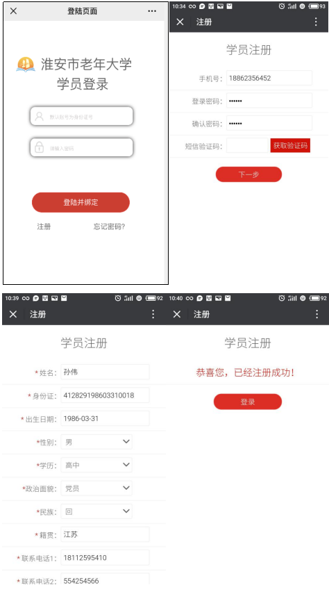 (二)新学员报名可点击注册按钮注册,填写自己的常用手机号码注册账号,完成后点击下一步完善填写个人信息,有*的项目为必填项,填写完整后点击保存按钮。