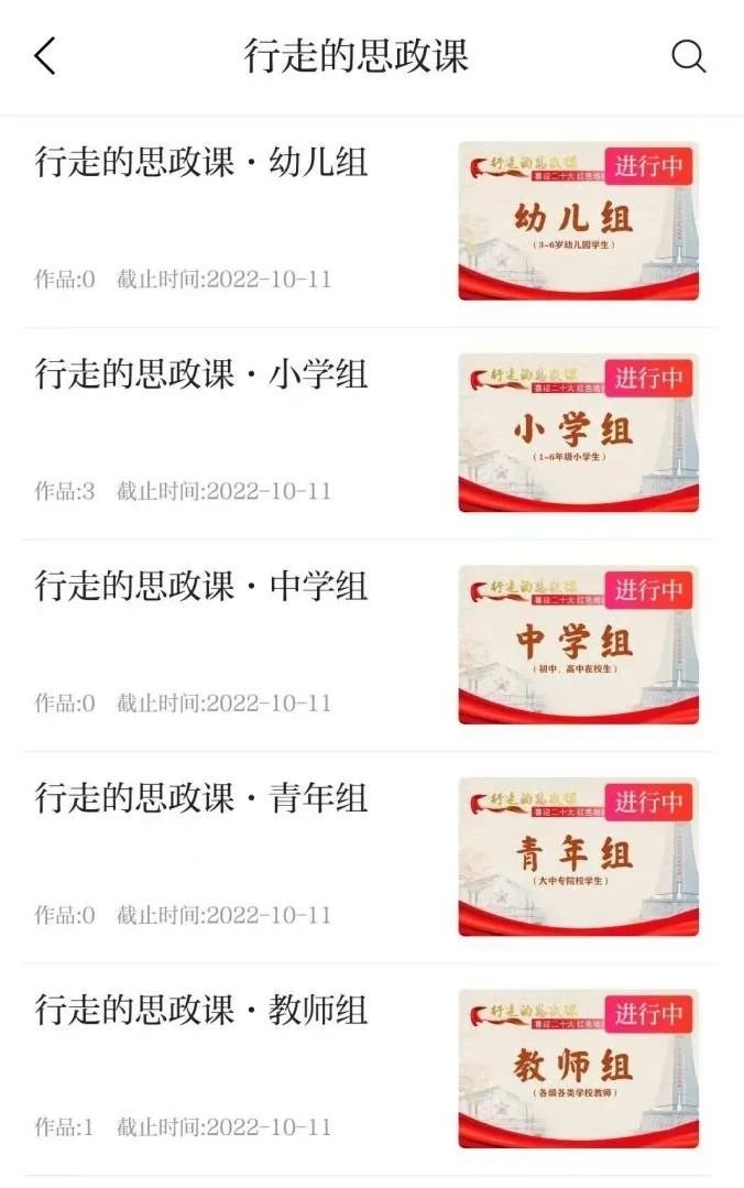 此次活动共分幼儿组、小学组、中学组、青年组和教师组,大家在活动分组上传页面找到相应组别点击进入。