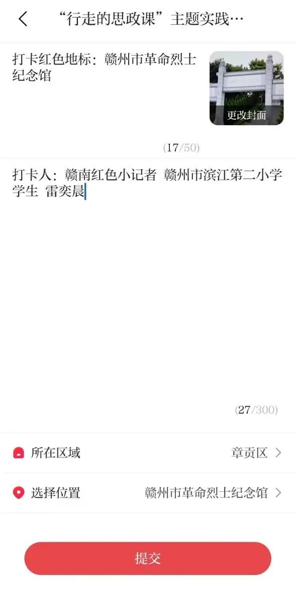 拍摄或上传完成后,认真填写作品标题、作品简介,并设置作品封面,选择好自己所在的区域位置,点击提交就完成了。作品简介里请记得标注“红色地标打卡人:XX学校XX年级(姓名)”。提交后,经后台审核通过,就能在相应分组页面下看到提交的视频了。
