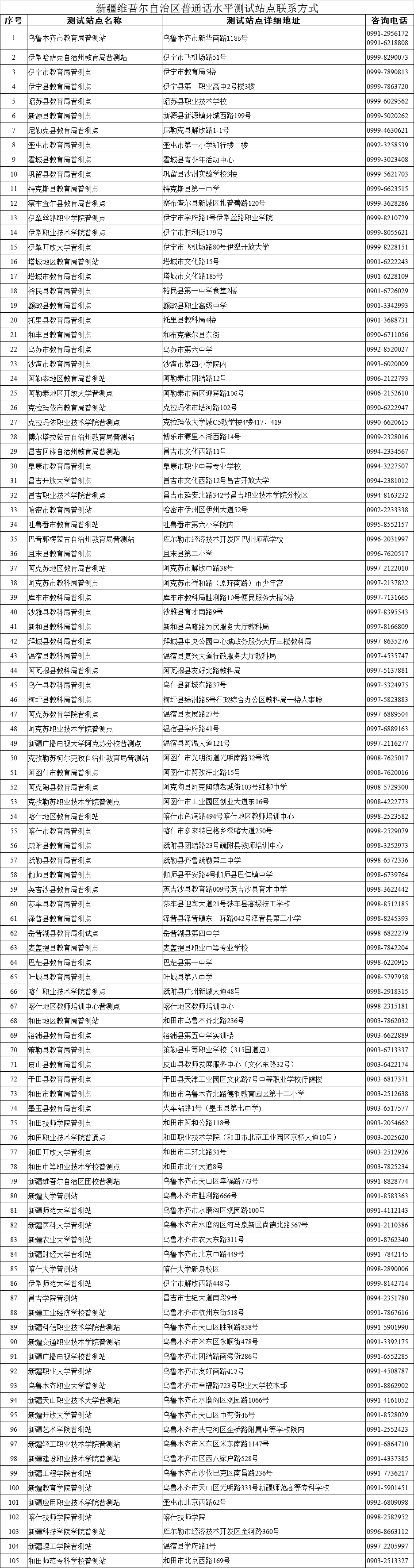 为进一步做好普测工作,更好服务广大考生,现将全疆各测试站点联系方式公布如下(请见附件),考生可拨打当地普测站点联系电话,咨询普测相关事宜。