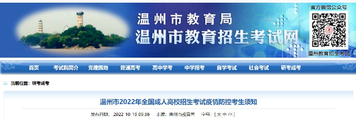 1.考生须在考前主动查询、了解浙江教育考试院及温州市教育考试院(www.wzksy.cn)网站发布的2022年成人高考疫情防控要求,遵守考试防疫相关规定。考生不按规定要求造成不能参加考试的,责任由本人承担。建议考生考前14天内尽量在考点当地避免流动,避免前往中、高风险地区和人流密集的公共场所。