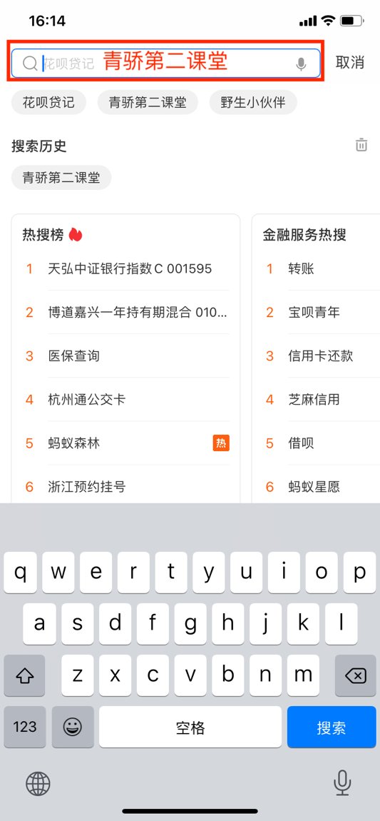 第一步:手机打开支付宝APP,首页搜索关键词“青骄第二课堂”
