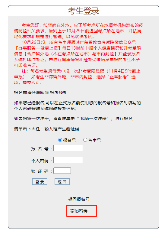 考生须通过健康上报系统进行申报,使用成人高考报名的账号(考生号)和密码登录进行健康申报和赴考受限信息申报。如忘记密码,可登录报名系统点击【忘记密码】操作找回密码。