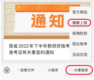 1.目前尚在考点所在地市以外(含省外及本省外市)的考生(不管是否因疫情原因滞留),均须通过省教育考试院微信公众号【办事服务—健康上报】,填写此类型的赴考受限登记,向考点所在招生考试机构报告。