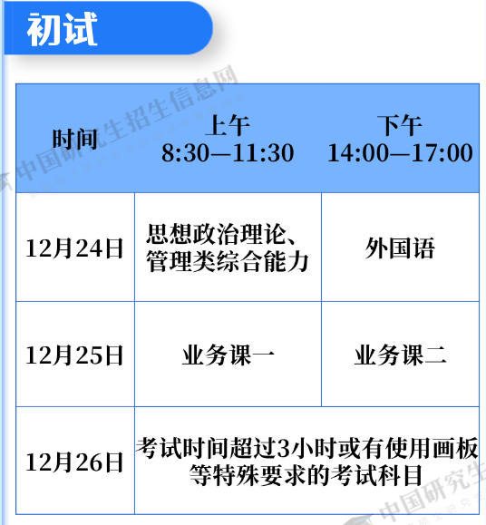 初试定于2022年12月24日至25日,考试时间超过3小时或有使用画板等特殊要求的少数考试科目安排在12月26日。
