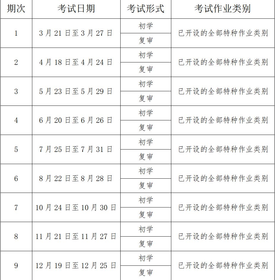 根据《中华人民共和国安全生产法》《特种作业人员安全技术培训考核管理规定》(原国家安全生产监督管理总局令第30号)等有关法律法规要求,生产经营单位的特种作业人员必须按照国家有关规定经专门的安全作业培训,取得相应资格,方可上岗作业。近日,市应急局发布2022年特种作业人员安全技术考试安排。自3月21日起,计划分9期安排考试。