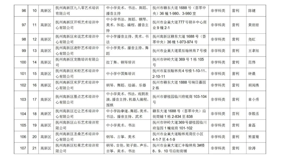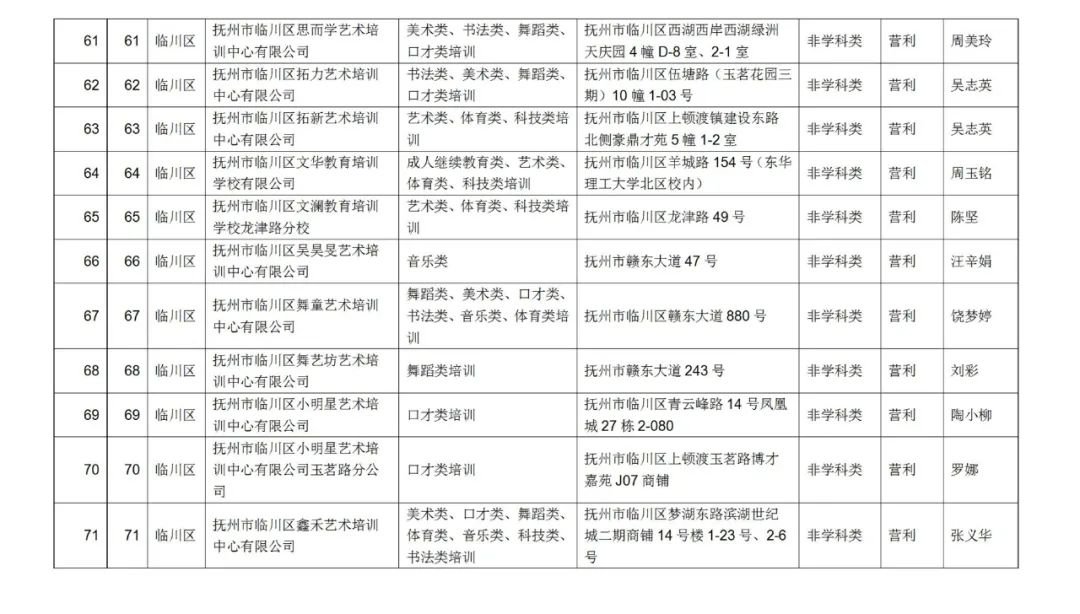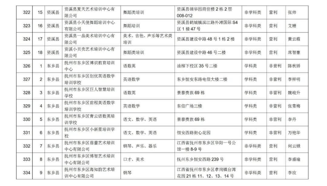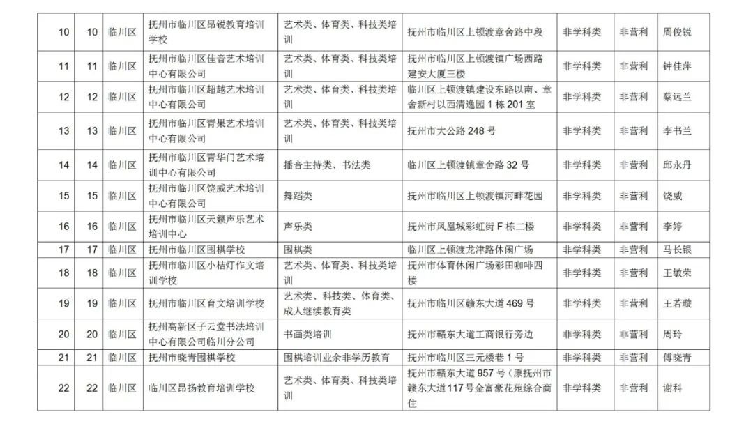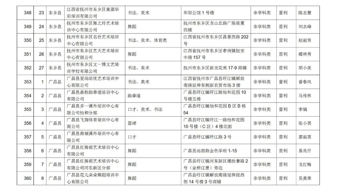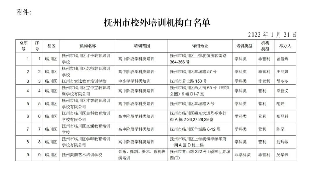 为贯彻落实国家“双减”工作决策部署和省、市有关工作要求,规范校外培训机构办学行为,切实减轻中小学生课外负担和家庭经济负担,抚州市对全市校外培训机构进行了集中整治和认真审核。现向社会公布抚州市第一批校外培训机构白名单,引导家长理性看待、慎重选择校外培训机构,多关注孩子身心健康,不盲目跟风报班,远离“无证无照”机构,保护自身合法权益,推进家校社协同育人,营造良好的教育生态环境。具体白名单见附件。
