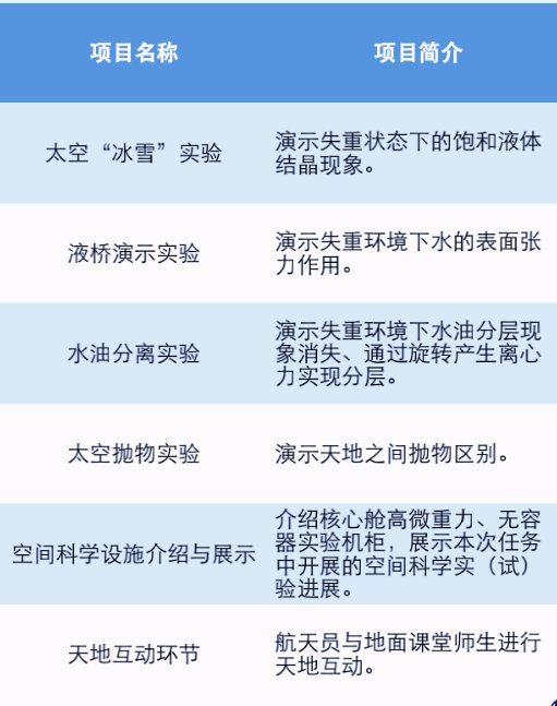 继续采取天地对话方式,由航天员在轨演示,太空“冰雪”实验,液桥演示实验,水油分离实验,太空抛物实验,介绍与展示空间科学设施。