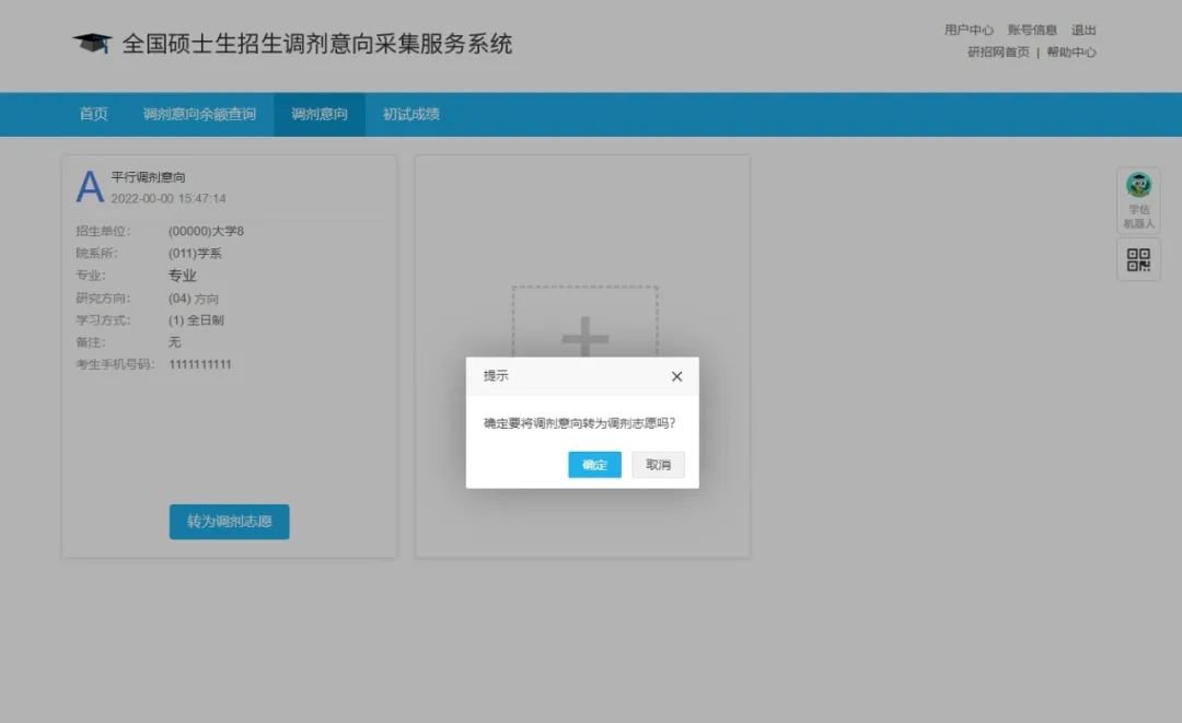 考生可在调剂服务系统开通24小时内,在满足条件的前提下,将调剂意向一键转为调剂志愿。