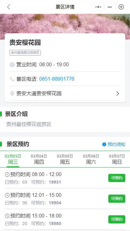 每天平坝农场樱花园每天有三个预约时段,分别是:08:00-12:00、12:01-15:00、15:01-18:00。