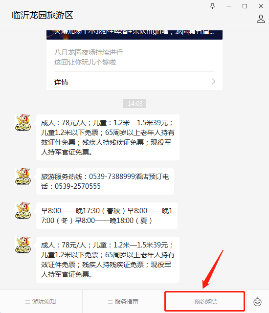 方式二:微信搜索“龙园旅游区”公众号,在底部菜单栏找到“预约购票”,进入页面后找到19.9元的票类,点击预定。