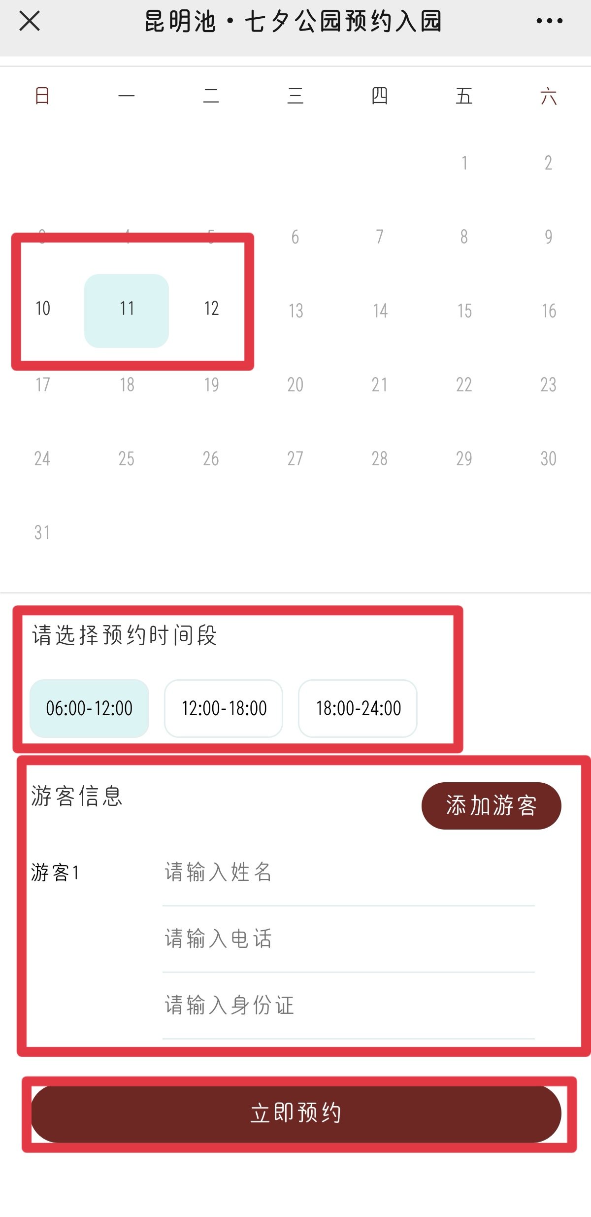 4、选择对应的日期和时间段并填写好游客信息后,点击“立即预约”即可。