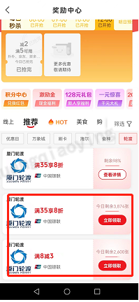 1、用户登陆云闪付APP ,在首页“奖励中心”免费领取“厦门轮渡”消费券,同一用户单日累计最多领取2张券(“游客船票”和“市民船票”各1张),单月累计最多领取4张券(“游客船票”和“市民船票”各2张)。