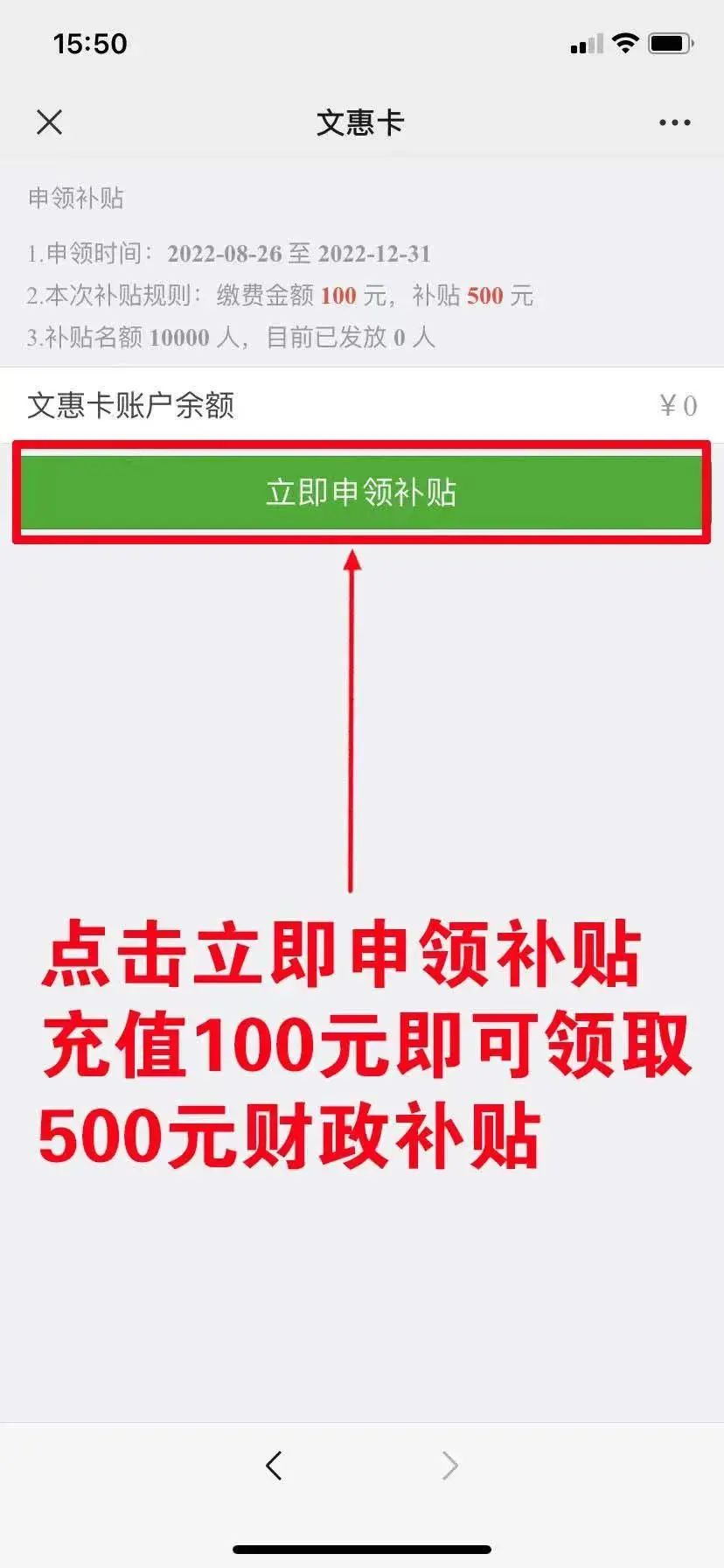 第二步:申领文惠卡财政补贴时,根据申领先后排名顺序,系统自动弹出“申领补贴”或“不申领”,选择“申领补贴”用户,验证成功后,申请人充值 100元,市级财政补贴即时到账,成为文惠卡财政补贴用户。