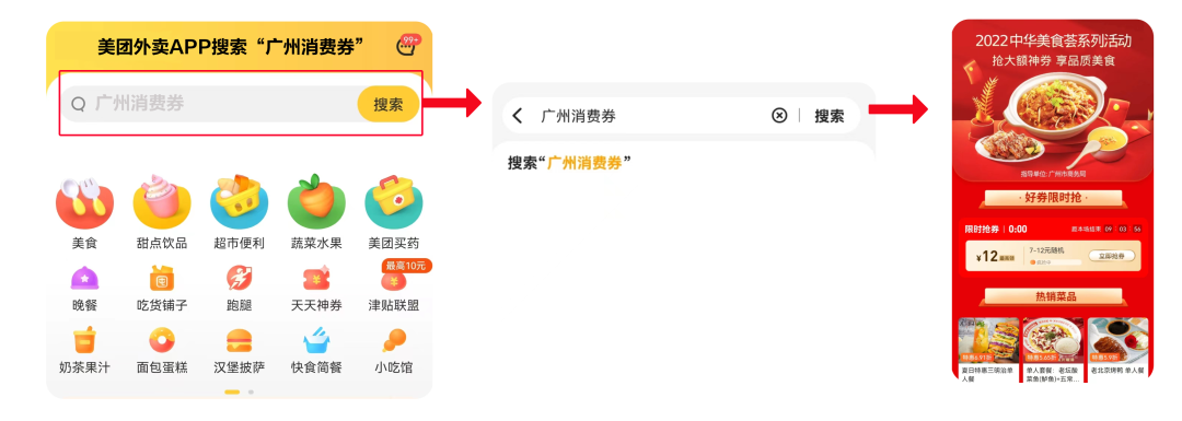 2、在搜索栏上输入关键词“广州消费券”,即可每人每日领取7-12元不等的券,领券后,单次餐饮外卖消费满30-55元或以上即可在活动特定商家用券进行餐饮外卖消费抵值。