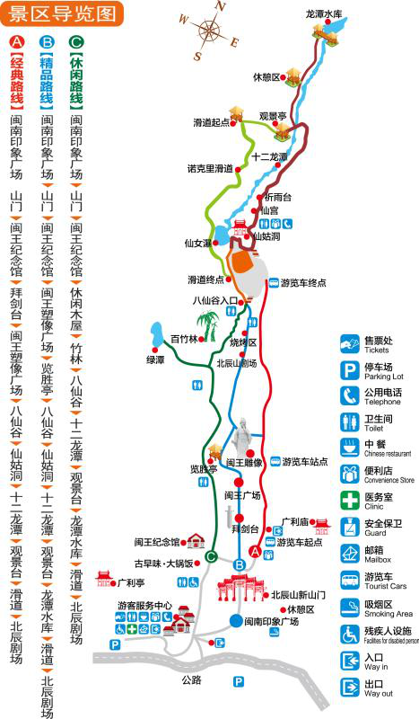 主要景观推荐:闽南印象广场、新山门、闽王馆、168步步高升道、拜剑长廊、王审知雕像、梦幻八仙谷、仙女瀑、仙菇洞、仙宫、十二龙潭瀑布、若克里旱滑道、龙潭水库等景观。