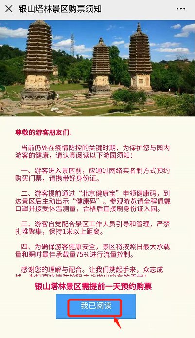 1、银山塔林景区实行实名制预约购票,需提前一天预约,每个身份证每日限购一张门票。