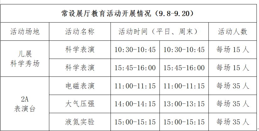 9月8日至9月20日北京中国科技馆主展厅活动时间表