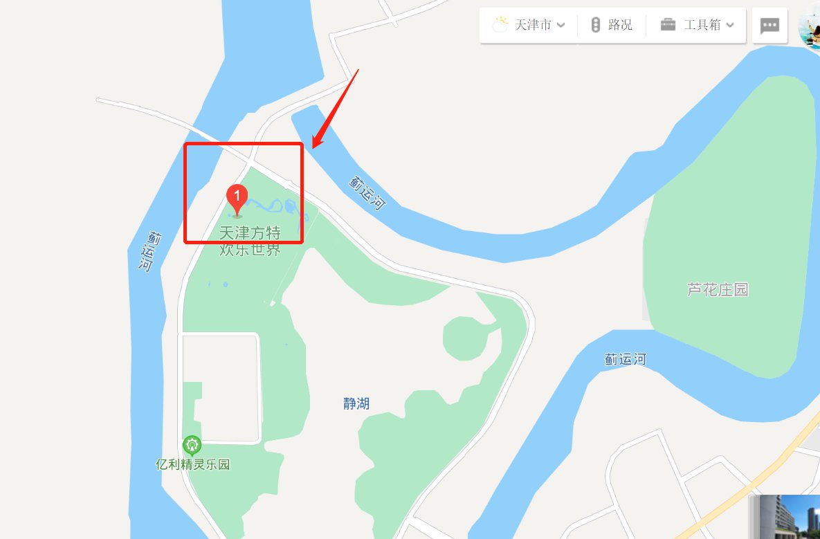 (2)汉沽方向沿【新开南路】直行进入【汉北路】,右转进入【运河中路】,直行右转进入【中滨大 道】,沿路行驶进入【中生大道】即可到达方特水上乐园。