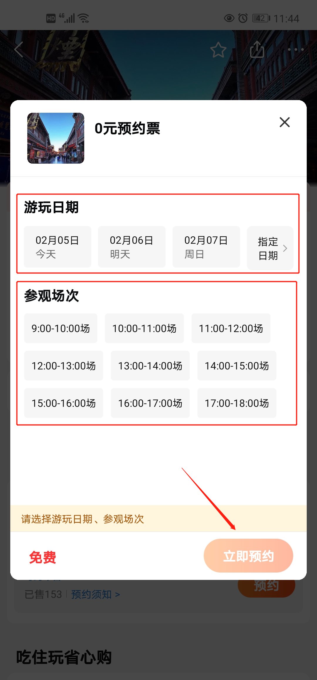 第二步:选择想要游玩的日期和入场时间,点击“立即预约”