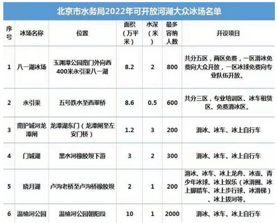 预计2022年1月上旬,北京市将根据天气和冰冻情况,陆续开放八一湖、永引渠西四环段、南护龙潭段、门城湖、晓月湖、温榆河公园等6处33万平方米河湖大众冰场,供市民参与体验冰上运动。