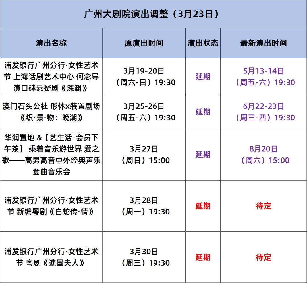 受近期各地疫情影响,广州大剧院很抱歉地通知您,新编粤剧《白蛇传·情》、粤剧《谯国夫人》无法如期上演将延期,延期时间待定,确定后将另行公告。