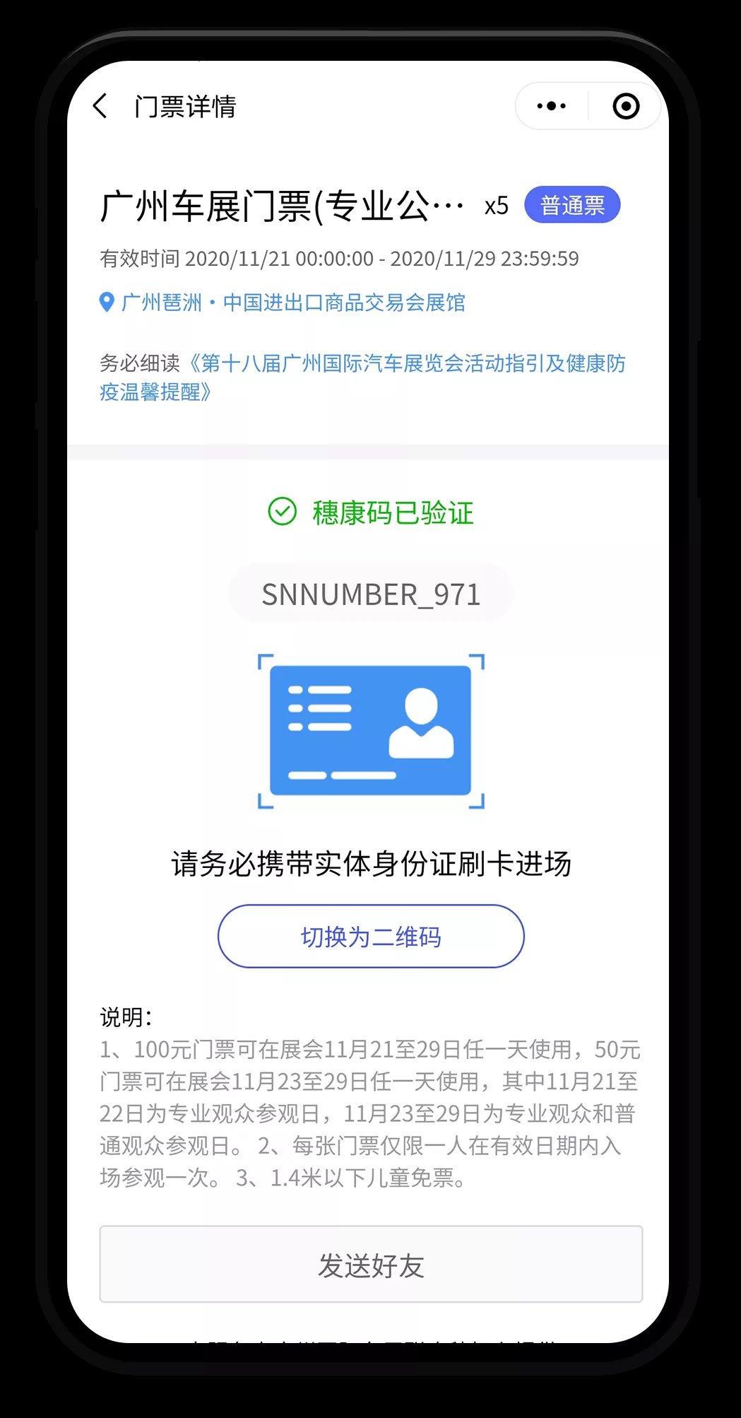 根据政府防疫相关部门的要求,观众需要通过展会官方微信进行实名制认证并刷身份证入场参观。观众通过“广州国际汽车展”官方微信,一次性完成门票购买、门票激活及实名认证。