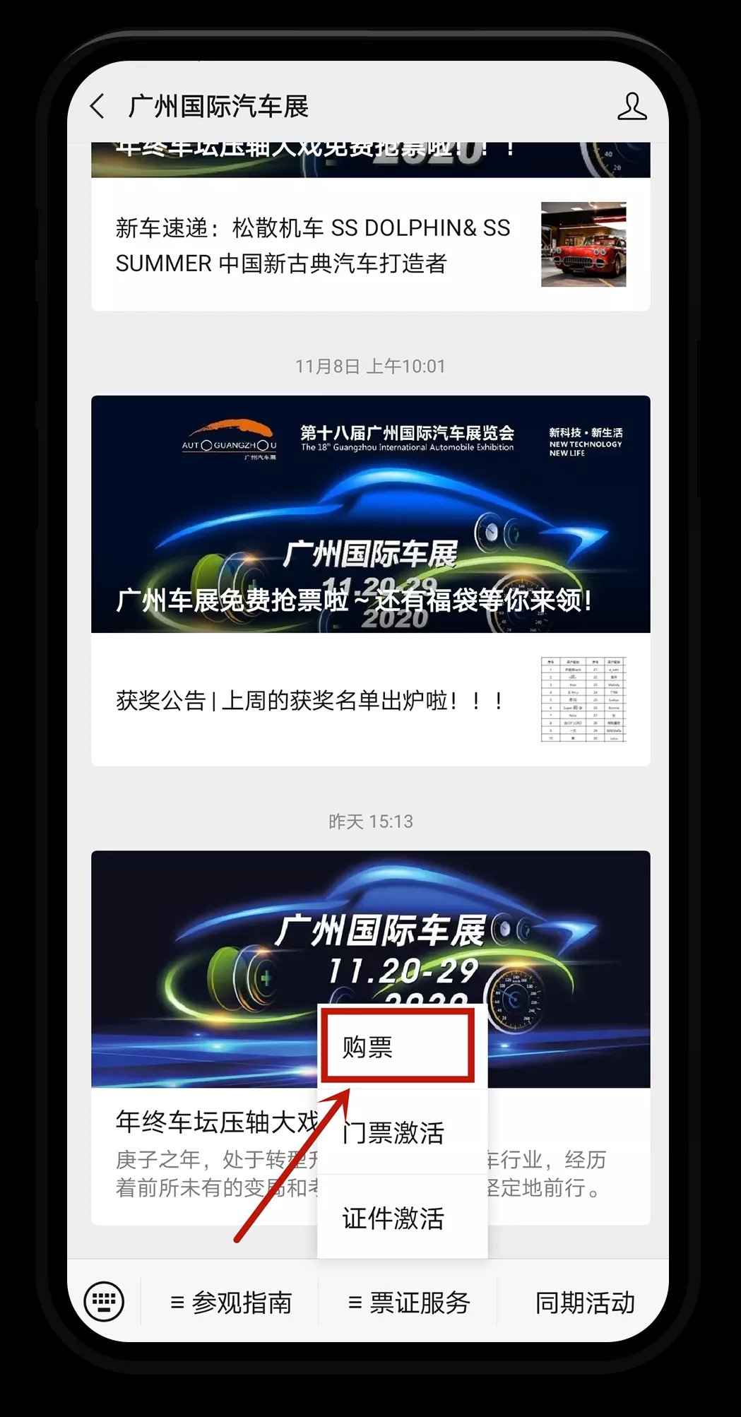 1、在“广州国际汽车展”公众号菜单栏下,找到“票证服务”—“购票”;