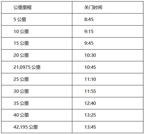 为了保证参赛选手比赛安全,限时对社会交通进行滚动封闭。比赛路线各段专设了赛时关门时间,关门时间之后,相应公里点的计时毯停止工作,相应路段将恢复社会交通。在规定关门时间内,未跑完对应距离的参赛选手须立即停止比赛,退出赛道,以免发生危险。退出比赛的选手可到沿途收容站搭乘收容车或自行选乘公共交通到达终点取衣区。关门时间按自然时间计算,具体见下表: