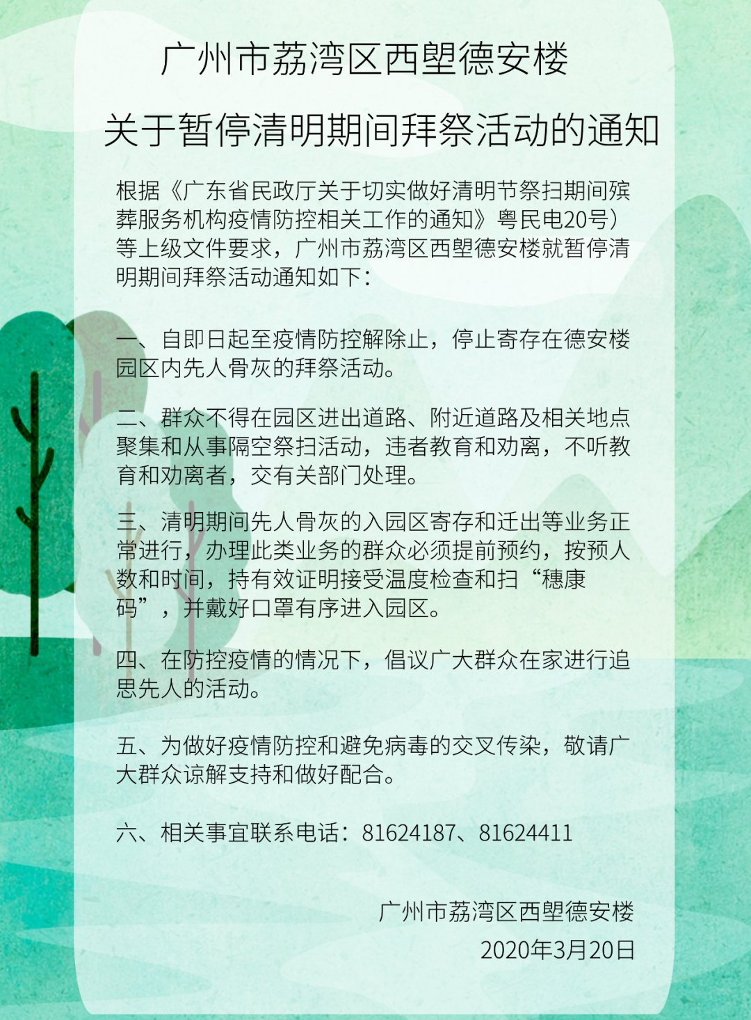 新冠肺炎疫情期间,为减少聚集,德安楼一直采取提前预约进园祭扫的工作模式。目前,根据上级民政部门的工作指引,德安楼已暂停现场祭扫,清明期间先人骨灰的进入园区寄存和迁出等业务正常进行,办理此类业务的群众必须提前预约,按预人数和时间,持有效证明接受温度检查和扫“穗康码”,并戴好口罩有序进入园区。