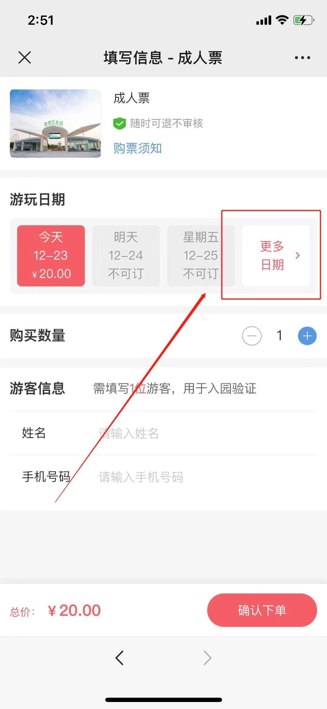 第二步:点击“购买”,游玩日期下方可以选择“更多日期”选择自己想要出行的那天。