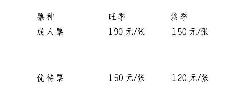 成人票价格为:旺季190元(6.29-8.31及国庆假期),淡季150元
