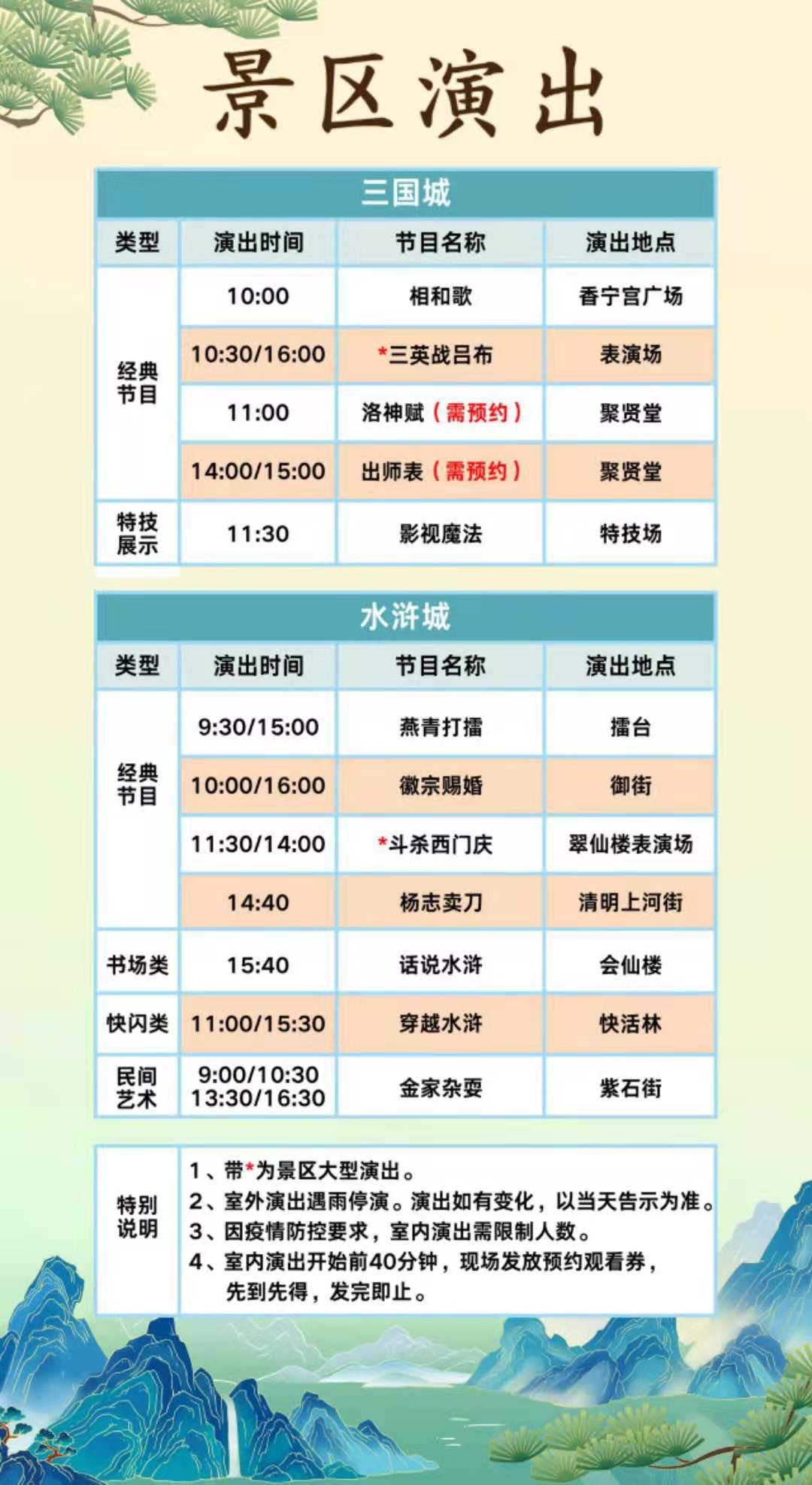 2、三国水浒景区每日运营时间:8:00—17:30,唐城景区每日运营时间:8:15—16:30(节假日适当延长)。