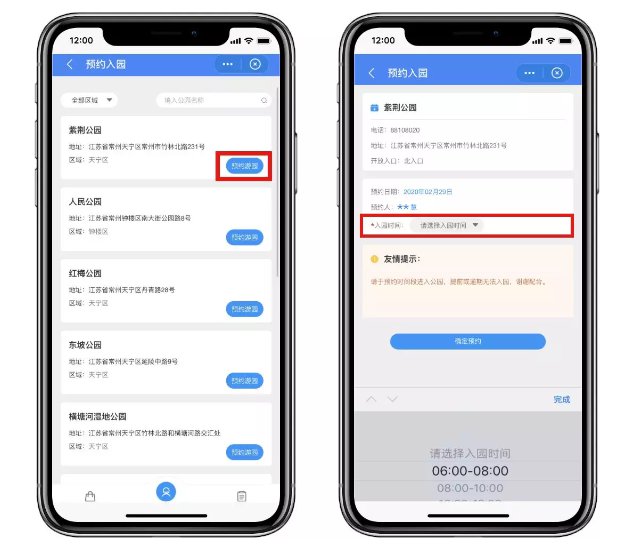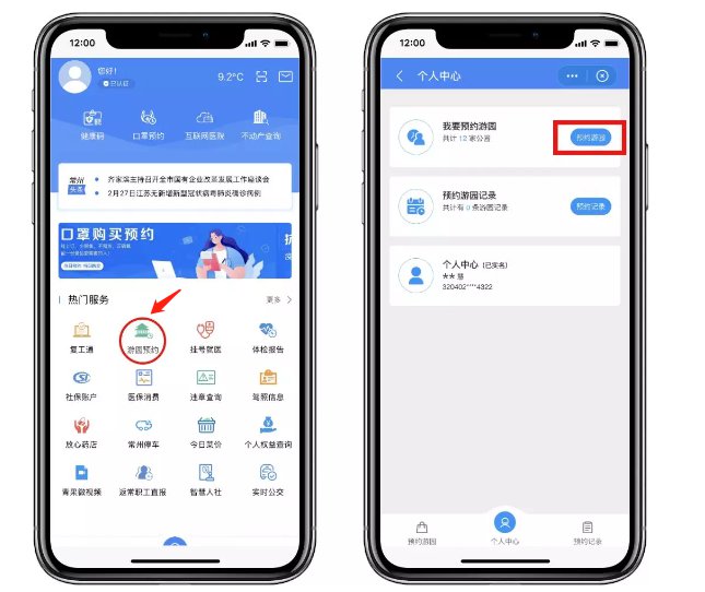 步骤一:在“我的常州”APP首页点击“游园预约”功能,进入页面后点击“预约游园”开始预约。