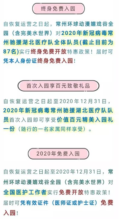 其中环球动漫嬉戏谷针对江苏驰援湖北医疗队中的常州医护人员实行终身免费开放的特惠政策。
