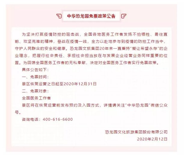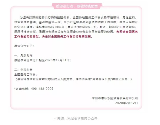 从2月11日开始,江苏天目湖旅游股份有限公司、江苏景尚旅业集团、恐龙园文旅集团等常州多家文旅企业纷纷推出致敬逆行者的特惠政策,对全国医护工作者实行免费开放: