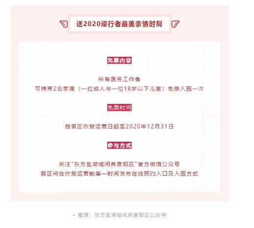 东方盐湖城宣布到今年年底,全国医务工作者凭医师证或护士证等有效证件可与2位家属(一位成人与一位18岁以下儿童)畅游东方盐湖城1次。