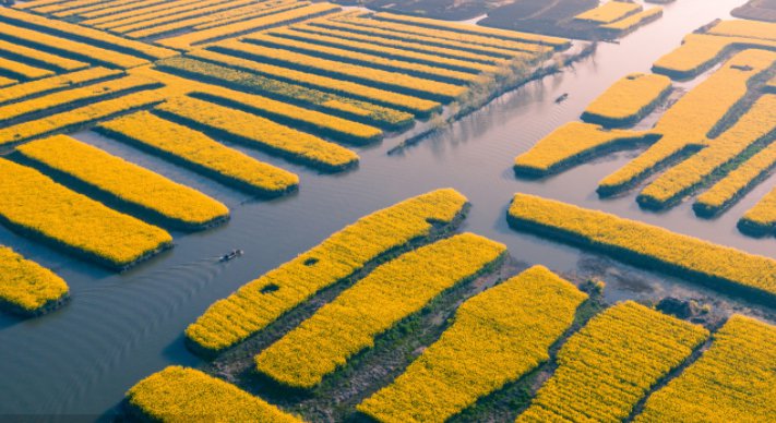 “河有万湾多碧水,田无一垛不黄花”,江苏省兴化市的20万亩油菜花每年的3月至4月份开始进入盛开期。江南水乡看水上油菜花,每年的清明前后,在兴化辽阔的水面上,千姿百态的垛田形成了上千个湖中小岛,岛上开满金灿灿的油菜花,在水面上形成一片金黄色“花海”,一望无际。