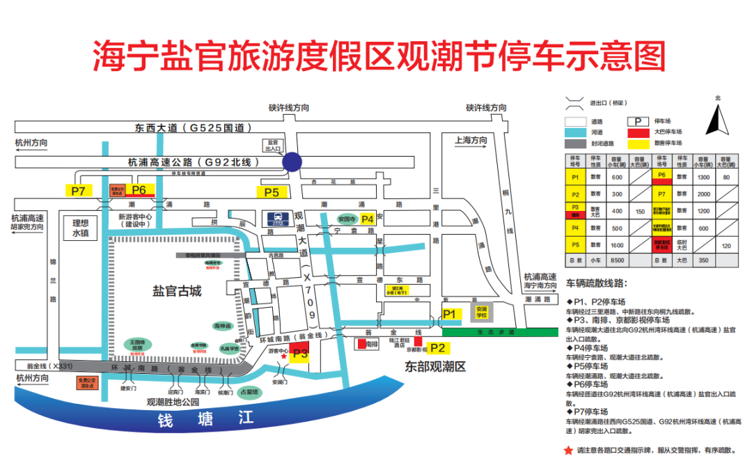 盐官景区设停车场10个、车位8850个,增加车位2000余个;丁桥景区设停车场9个、车位3600个。其中,盐官景区将启用P6、P7停车场,同时杭浦高速盐官出口设置专用匝道,小型客车直通P6、P7停车场,P6停车场设置了公交转驳,停在P6、P7停车场的游客可以到6号停车场乘坐公交车转驳进景区观潮。
