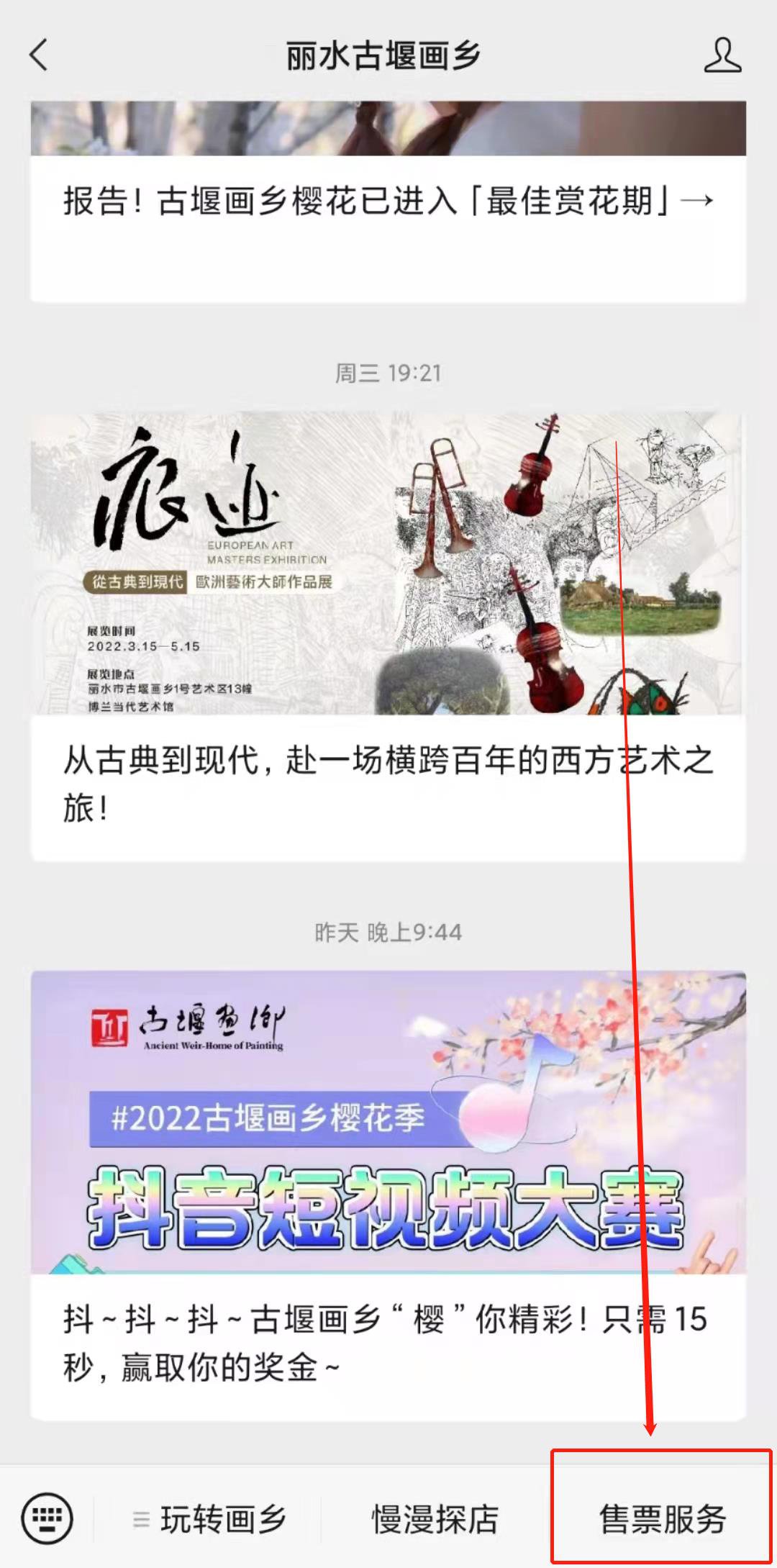 1、关注“丽水古堰画乡”微信公众号;