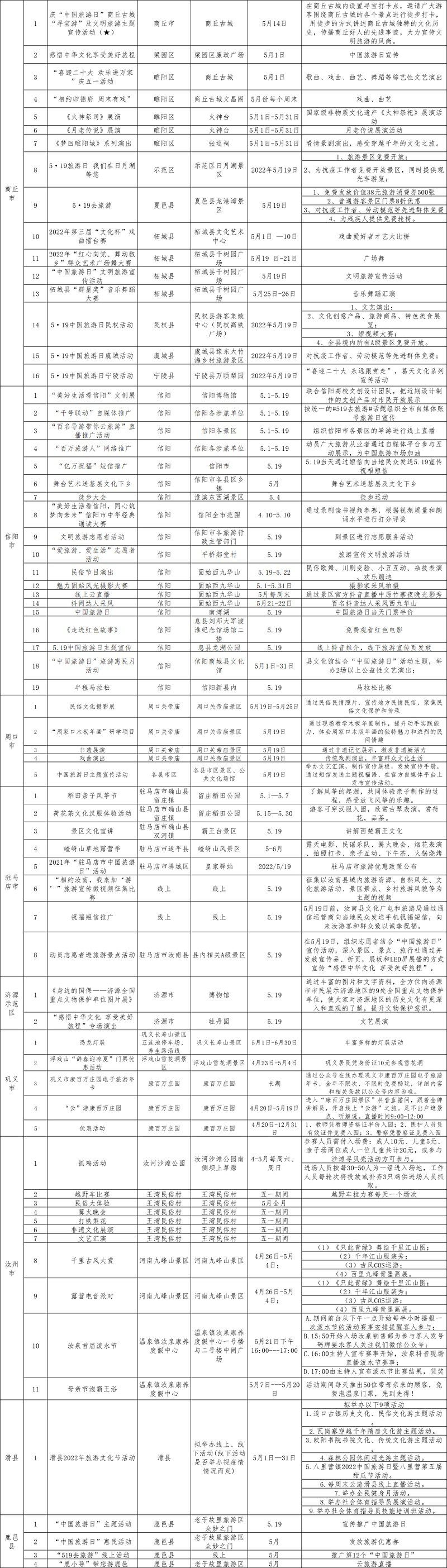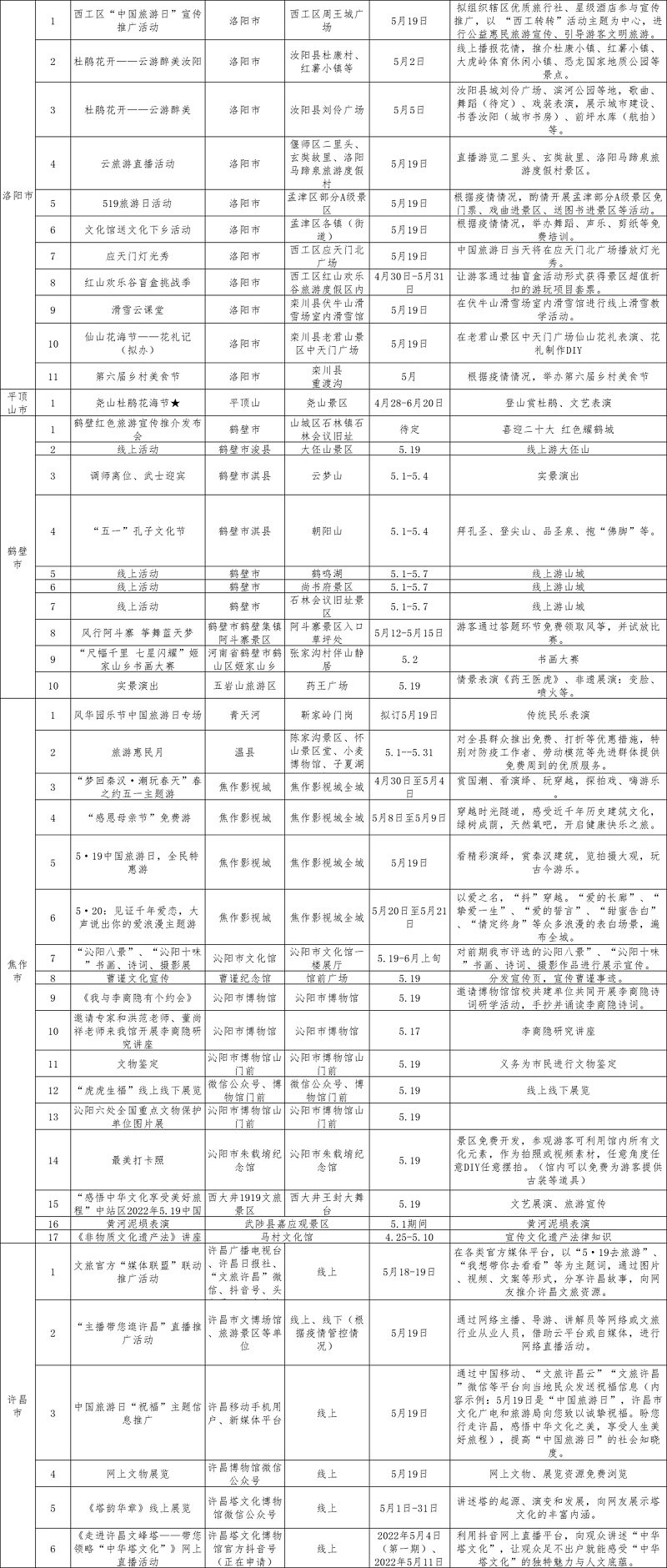 “中国旅游日”河南部分活动和优惠措施见下表: