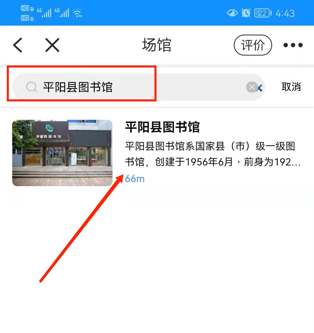 02、选择图书馆->搜索平阳县图书馆->点击平阳县图书馆