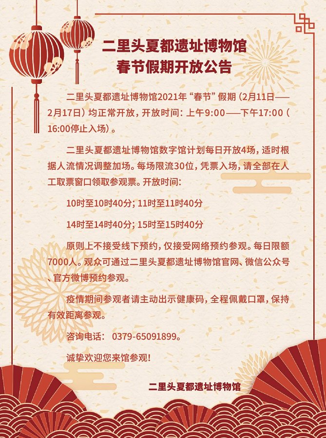 二里头夏都遗址博物馆坚持限量、预约、错峰的原则,严格落实场馆内部定时消杀等防疫措施,并就春节期间参观提醒如下: