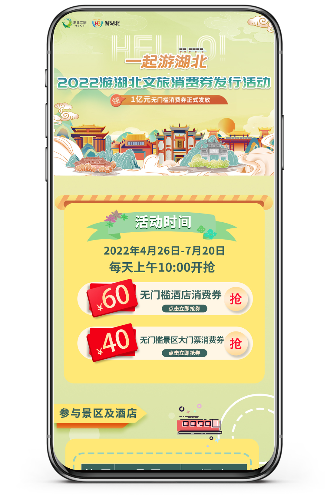 第一步:打开「游湖北」小程序/APP,点击弹窗或广告页面进入;或顶部搜索框“消费券”直接进入活动页面
